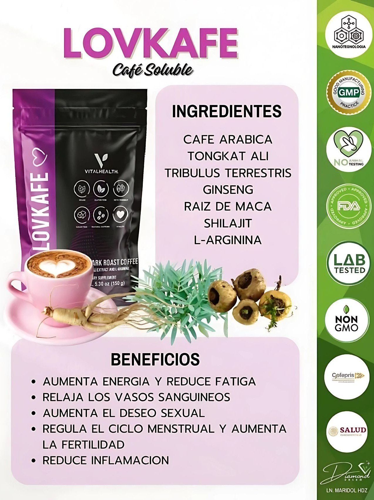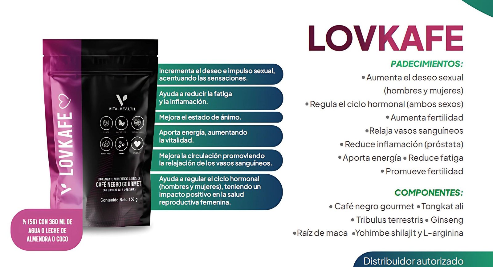 LOVKAFE es un suplemento alimenticio en forma de café soluble, diseñado para mejorar el deseo sexual, la energía y el balance hormonal de manera natural. Su fórmula combina ingredientes funcionales de alta calidad que aportan vitalidad, bienestar y un sabor delicioso, ideal para quienes buscan rendimiento físico, salud sexual y energía diaria en una sola taza.