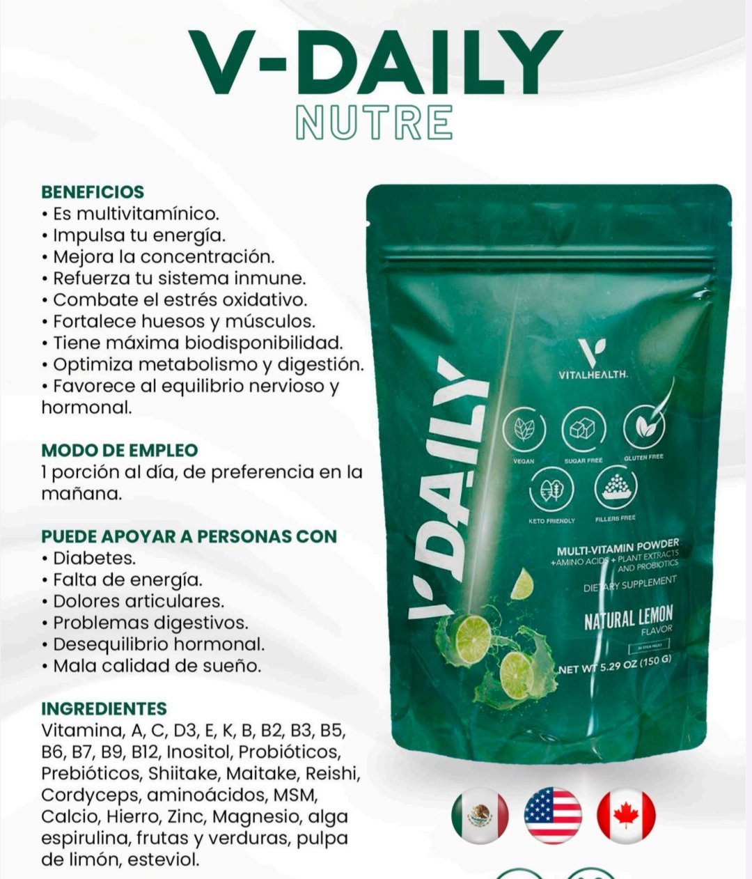 V-Daily está diseñado para complementar tu alimentación y darle a tu cuerpo las vitaminas y minerales esenciales que necesita para funcionar al máximo. Con cada cápsula, apoyas tu energía, fortaleces tu sistema inmunológico y cuidas tu salud de manera integral. Ideal para quienes buscan mantenerse activos, con vitalidad y protegidos día a día.