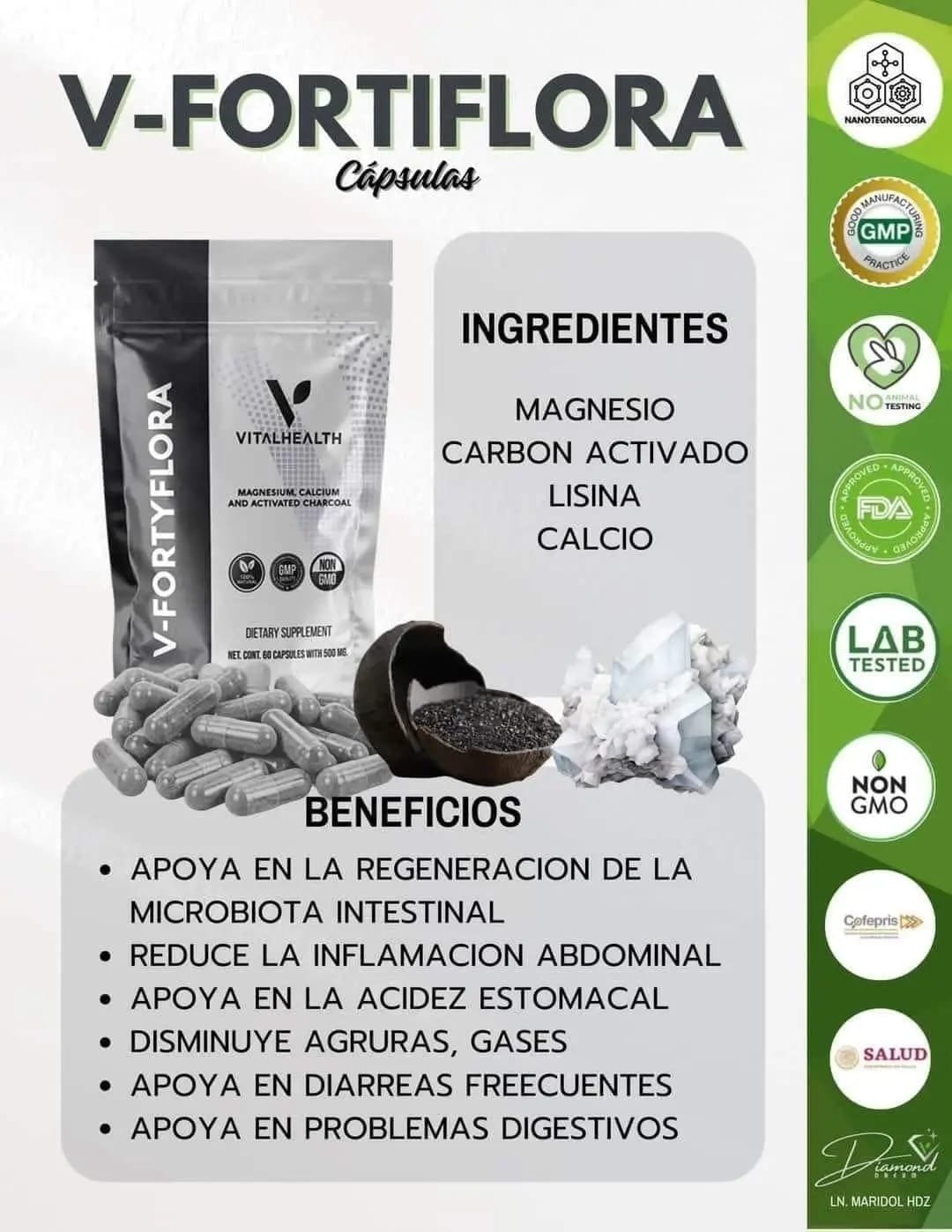 V-Fortyflora de VitalHealth está diseñado para promover una digestión saludable y mantener el equilibrio natural de la flora intestinal.