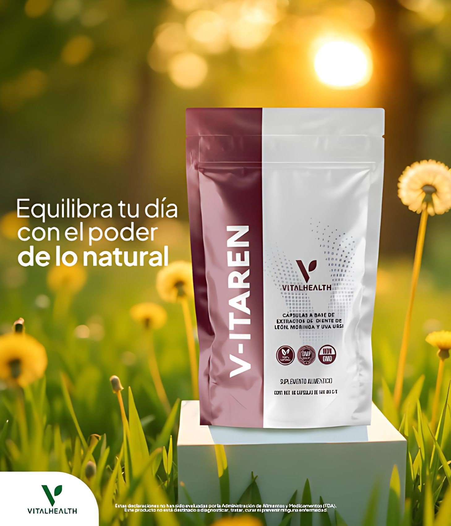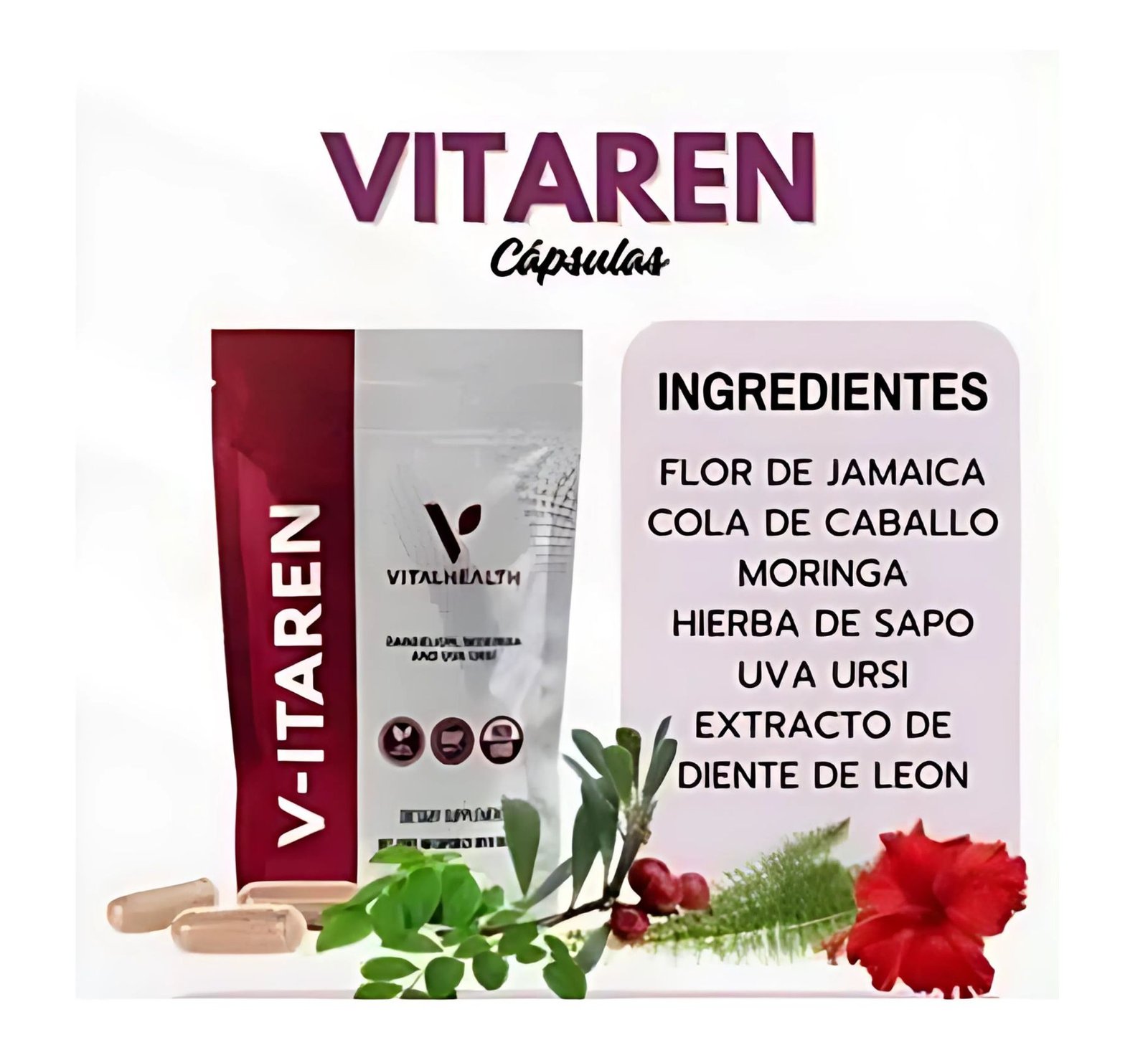 VITAREN de VitalHealth es un suplemento alimenticio en cápsulas, formulado con ingredientes herbales reconocidos por sus propiedades depurativas y diuréticas.